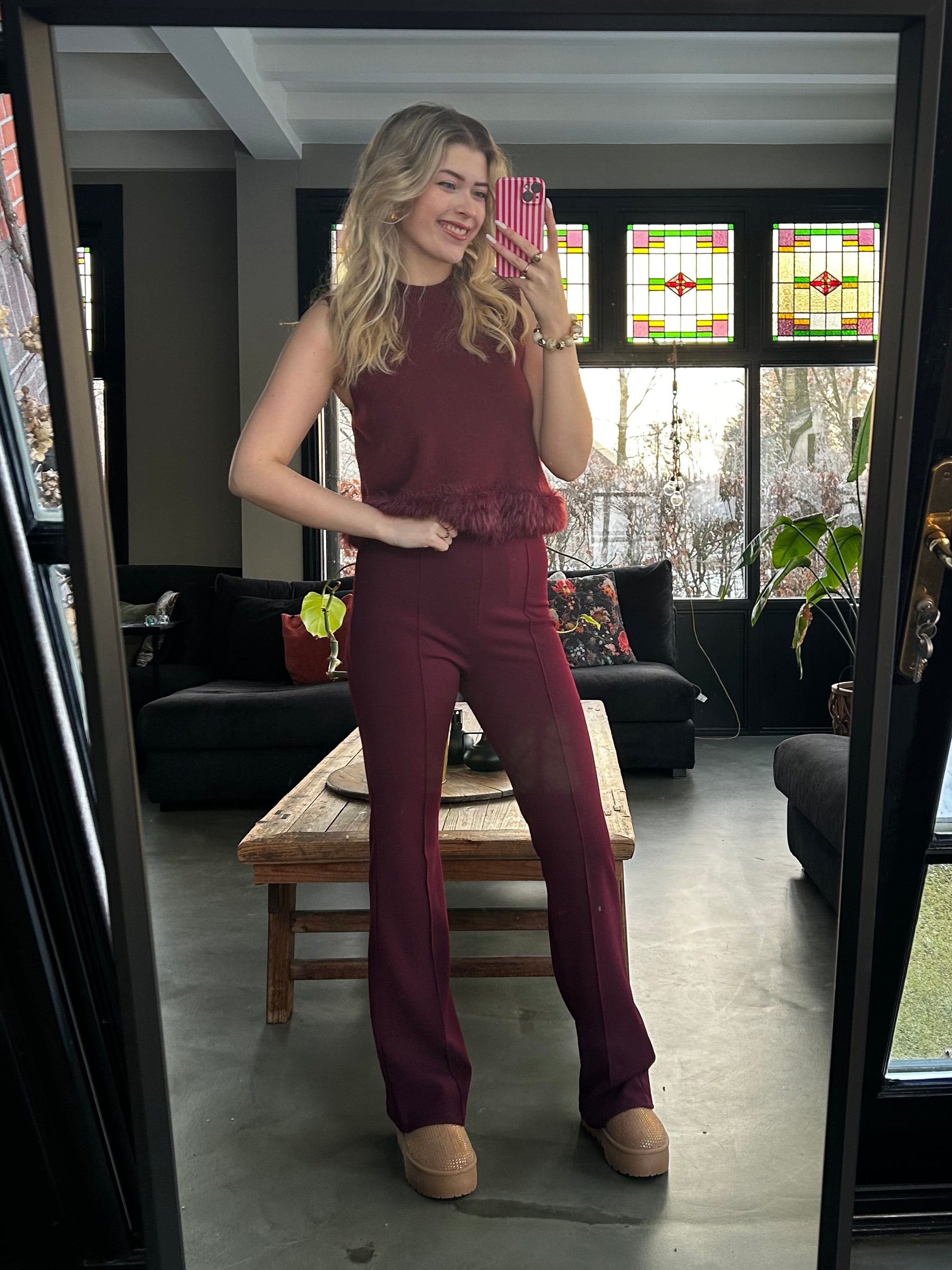 Deze bordeauxkleurige broek heeft een aangesloten pasvorm met flair pijpen en een elegante naad aan de voorzijde. De hoge taille zorgt voor een mooi silhouet en de stof valt soepel. De broek is makkelijk uit en aan te trekken door de rits aan de zijkant.
