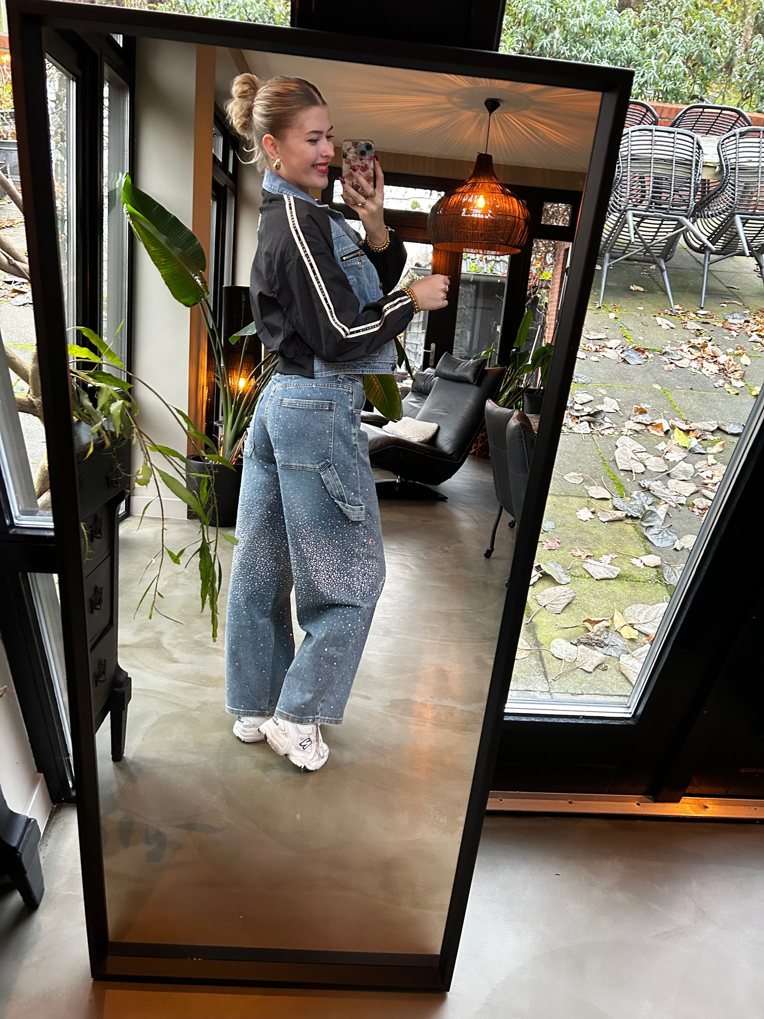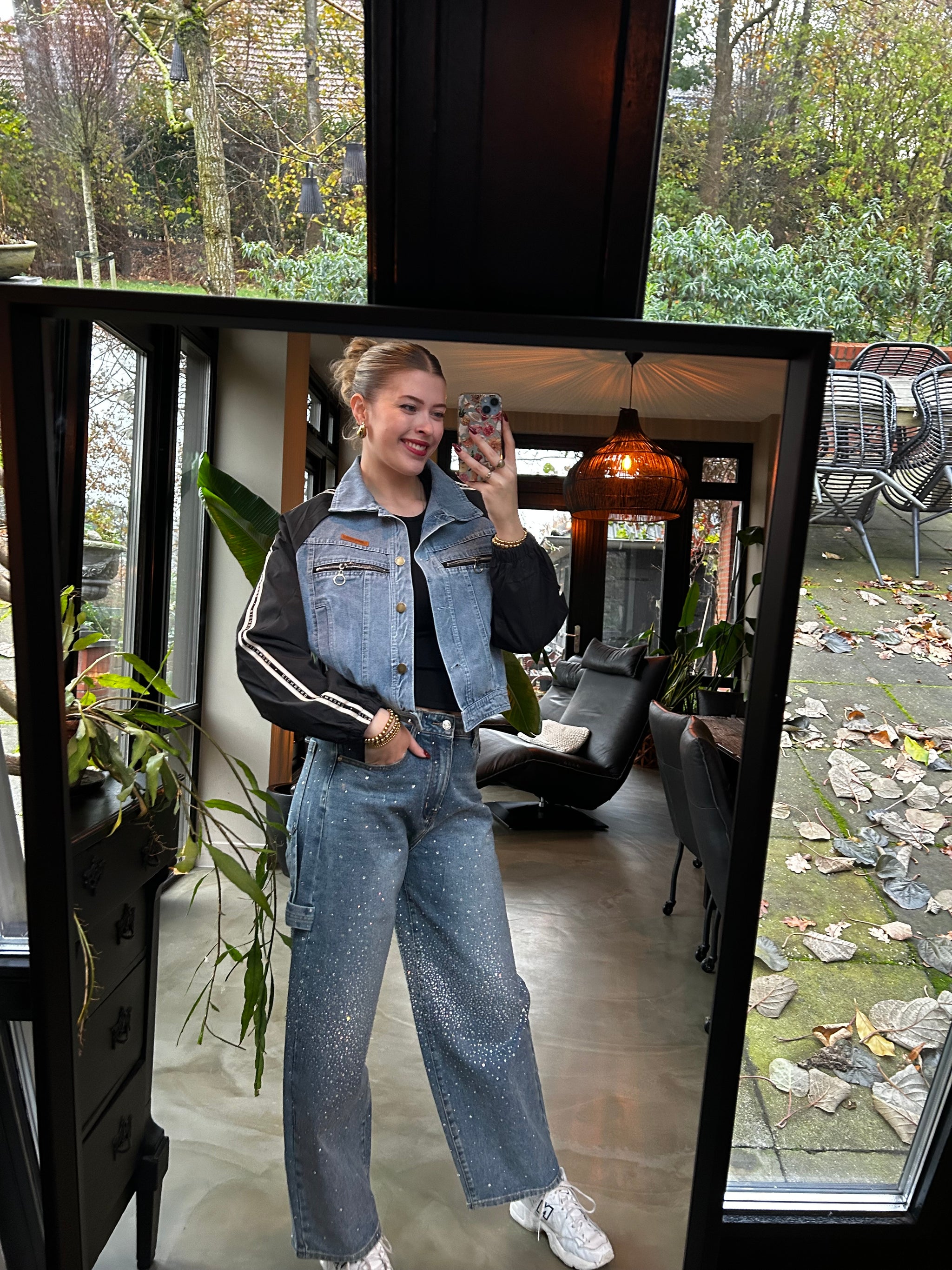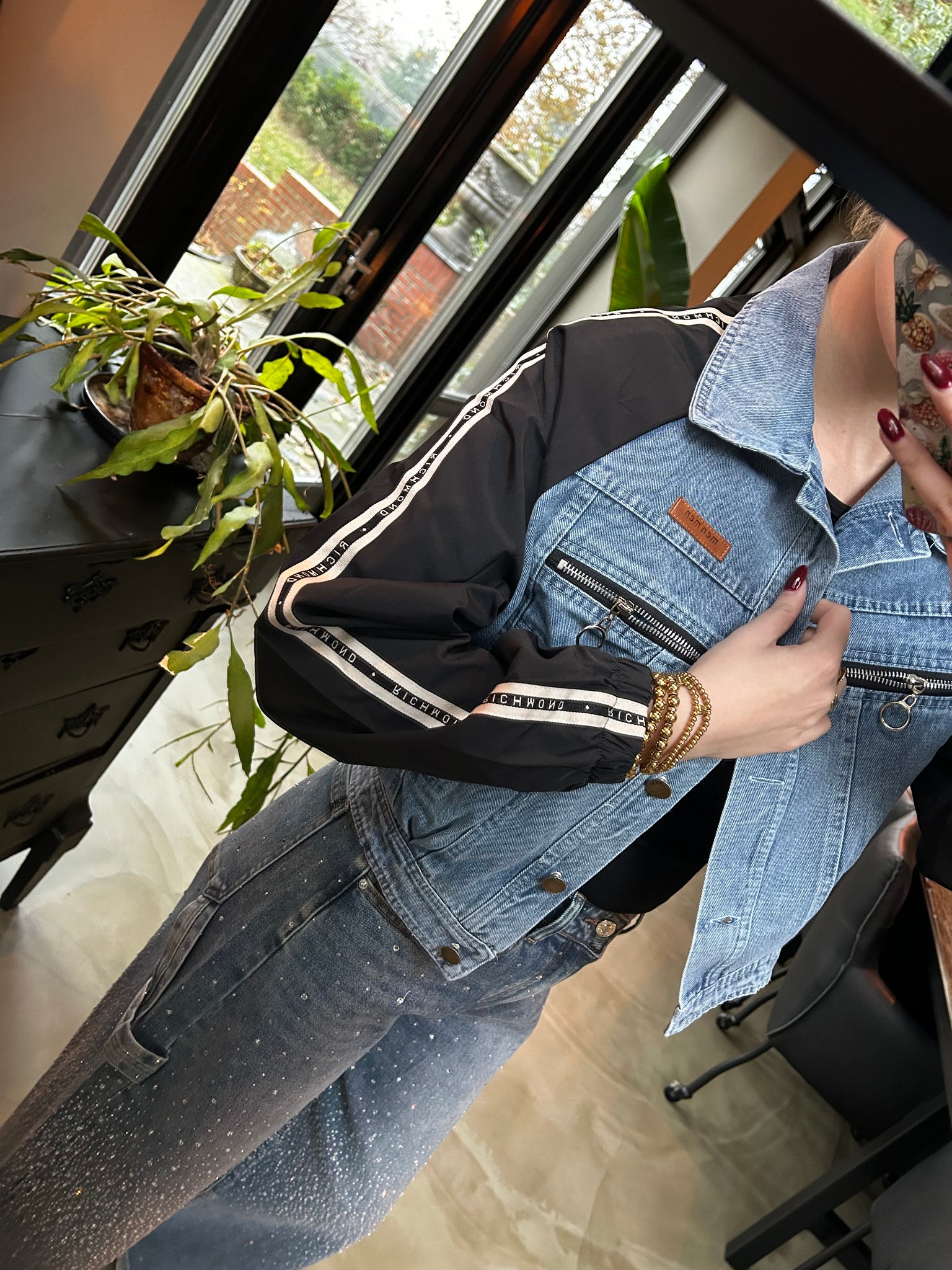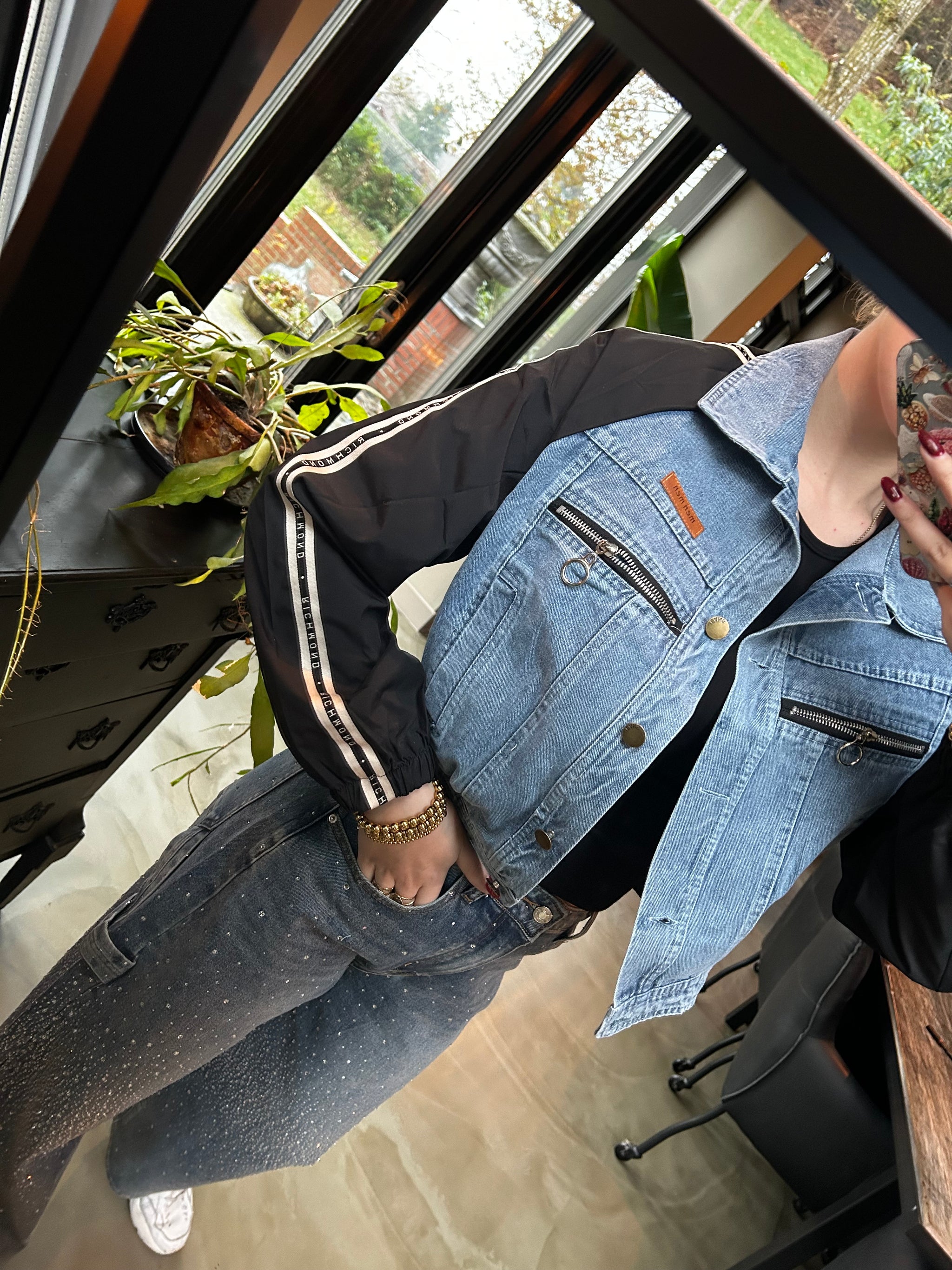 Deze unieke jas combineert denim met sportieve windbreaker-mouwen voor een stoere, moderne look. De denim body heeft opvallende ritsdetails, terwijl de zwarte mouwen zijn afgewerkt met een gestreepte tekstband voor een trendy streetstyle-uitstraling. Licht, comfortabel en perfect om elke casual outfit direct extra pit te geven.