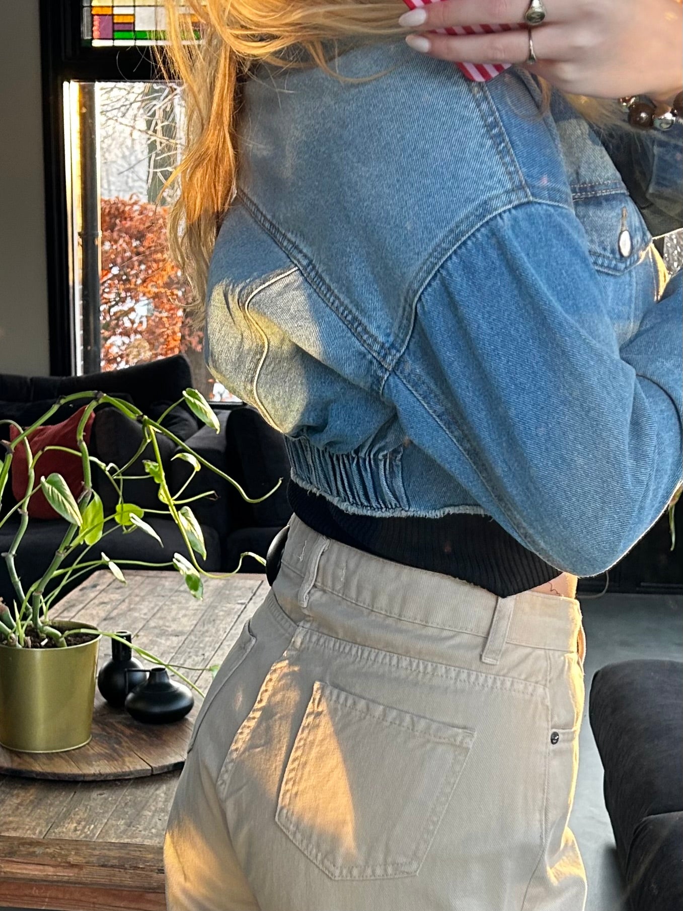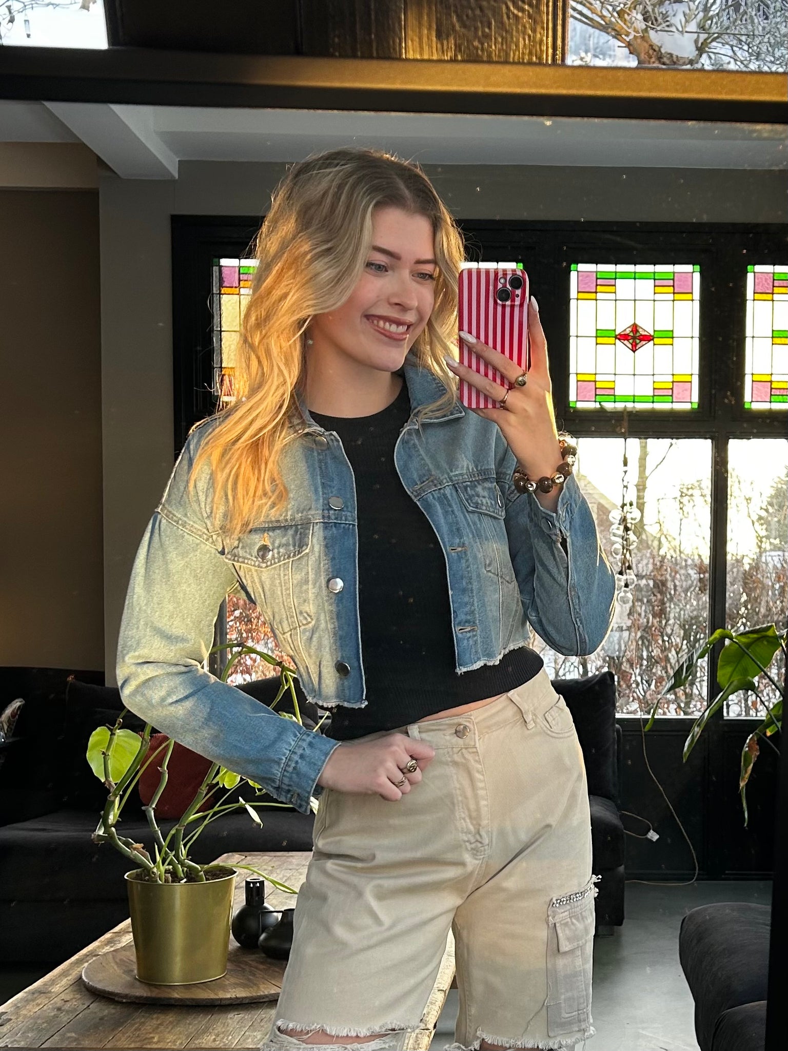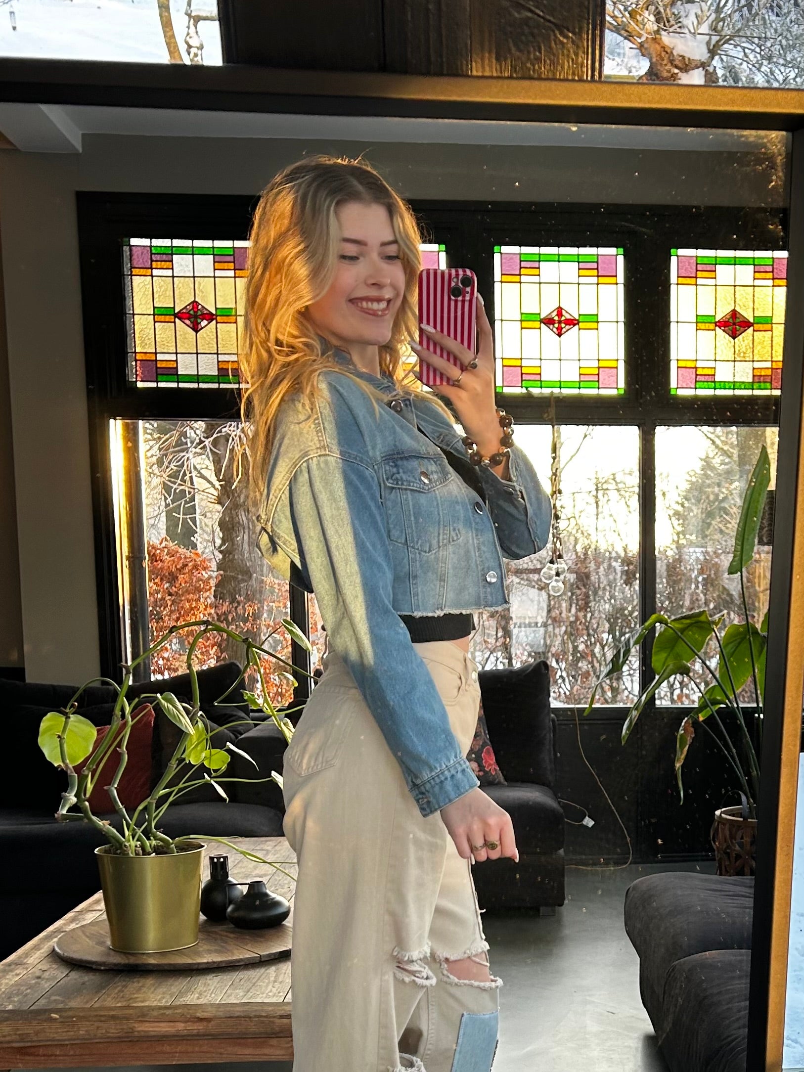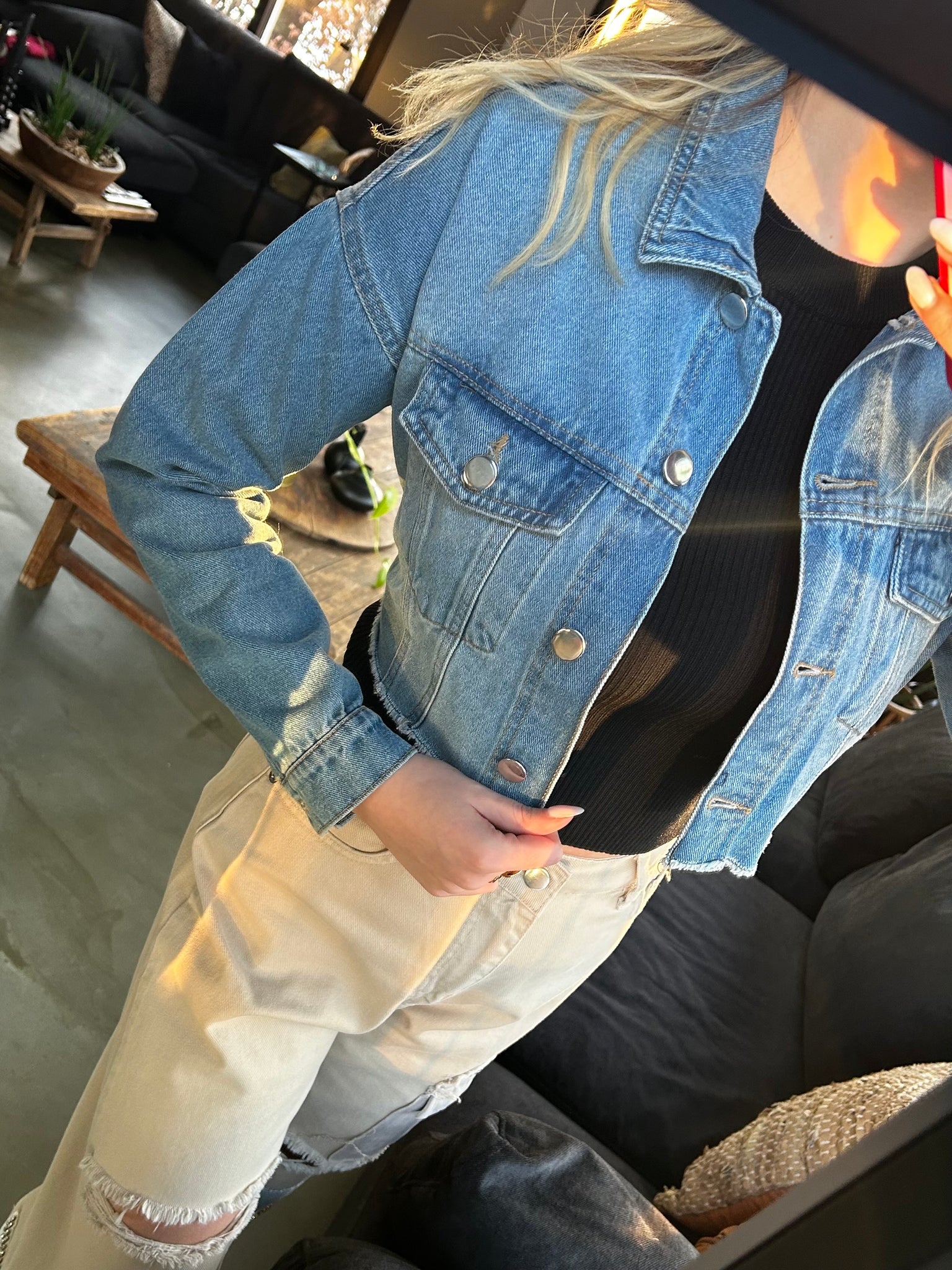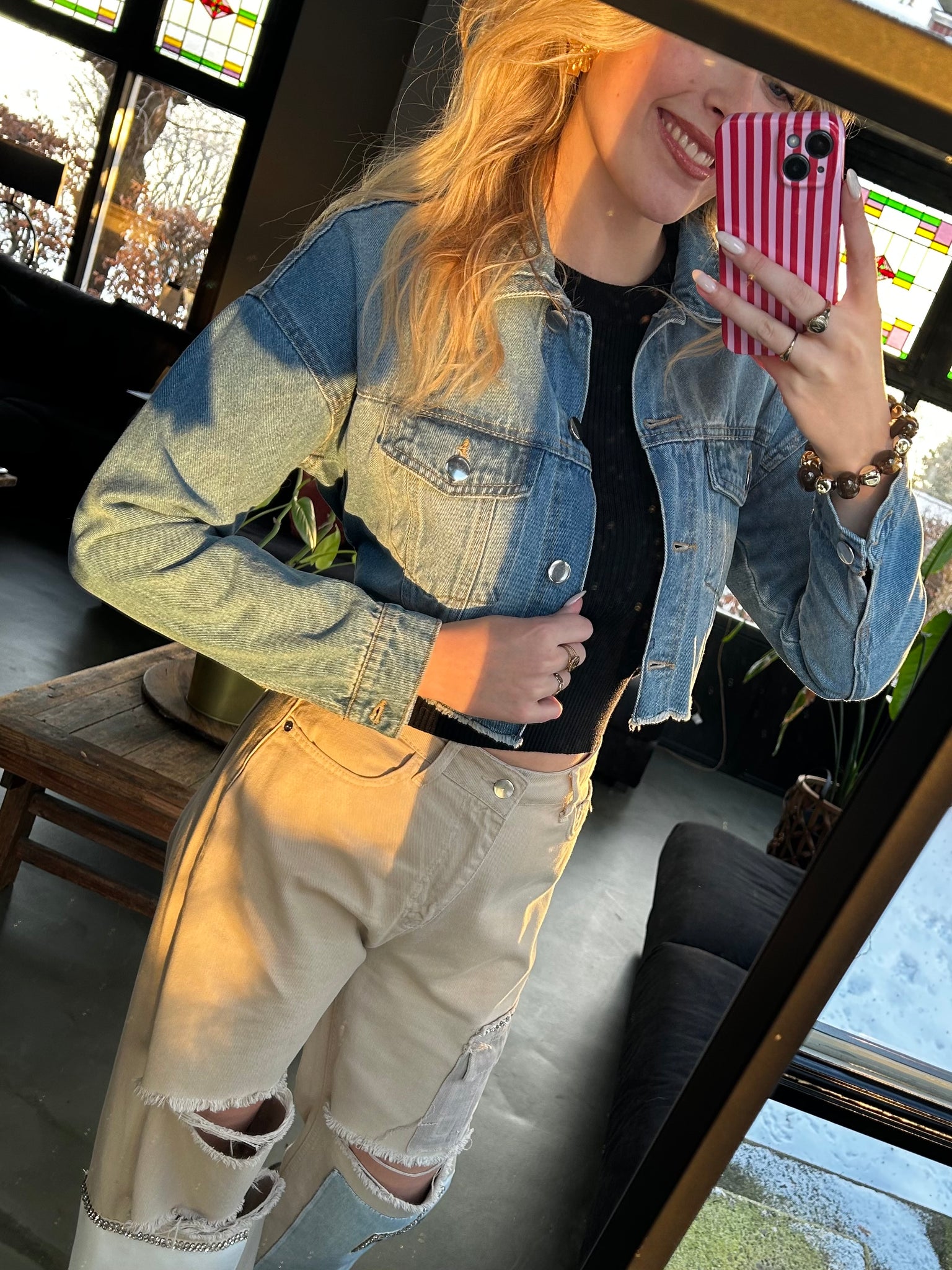 Een frisse twist op het klassieke spijkerjack. Dit cropped jasje heeft een stoere denim wassing en een elastische band aan de achterkant, waardoor het mooi aansluit en een speels silhouet creëert.
