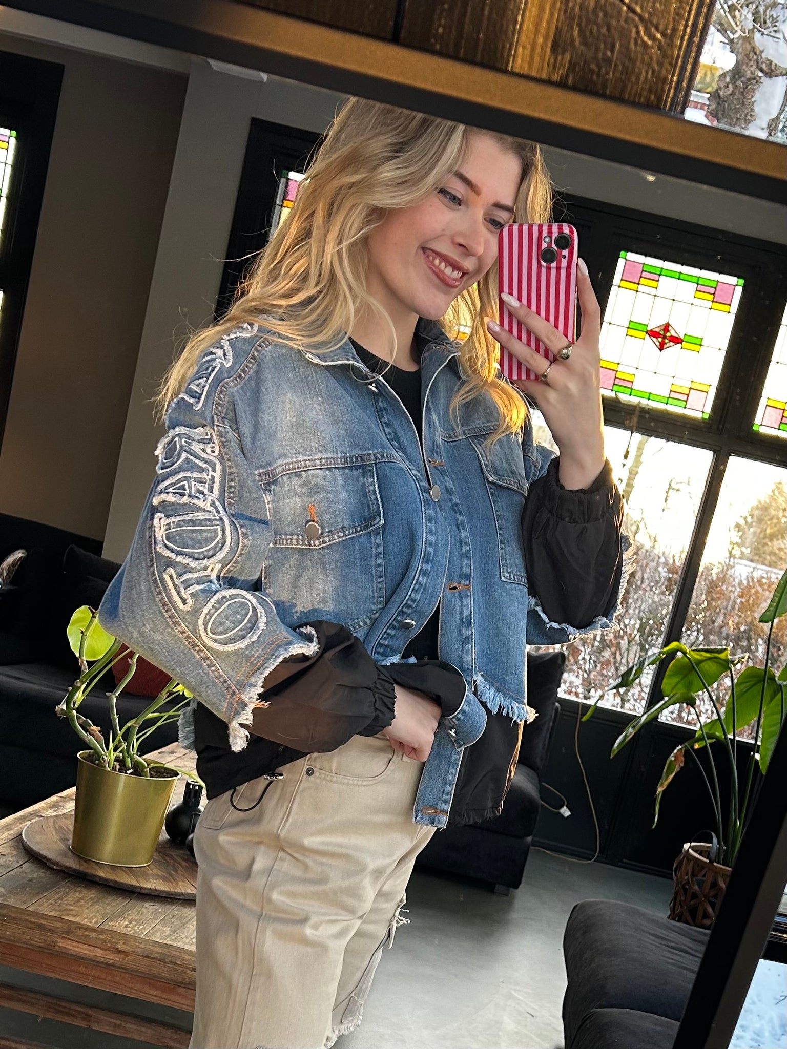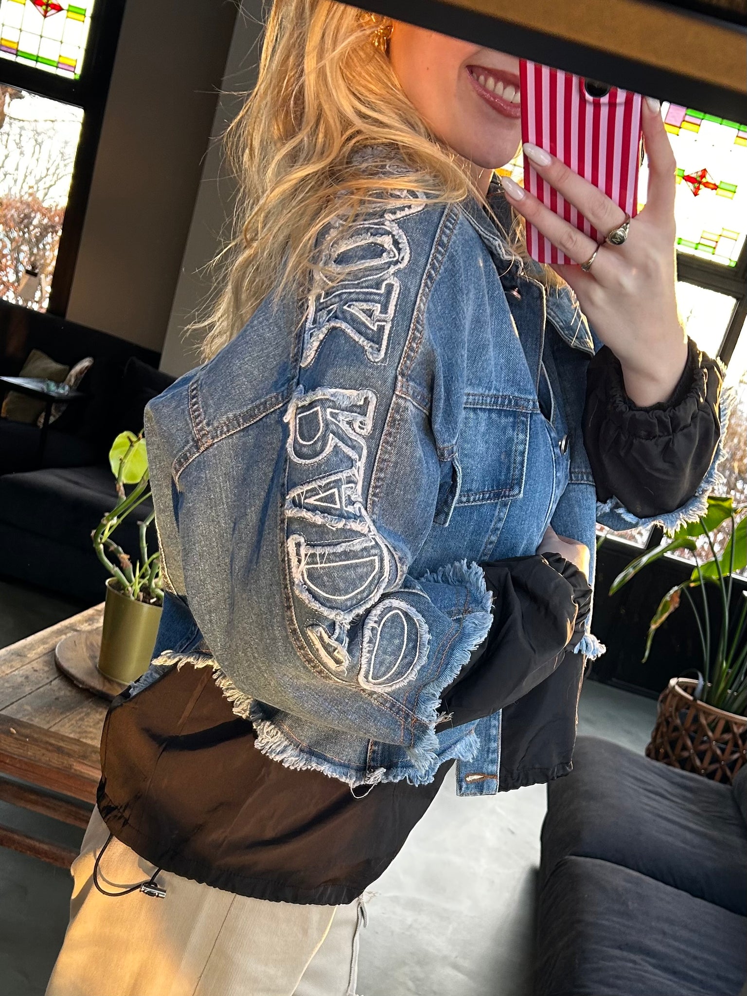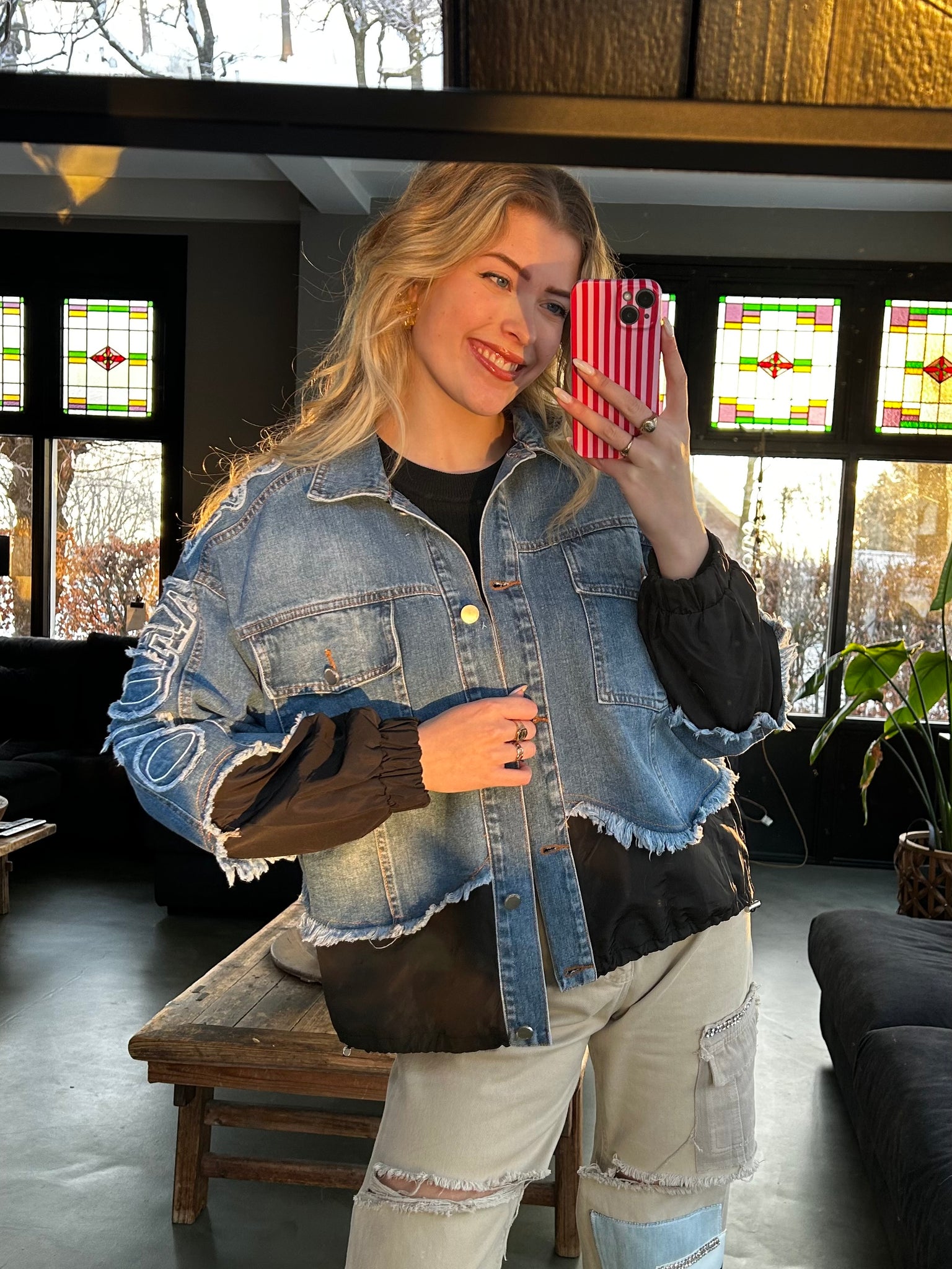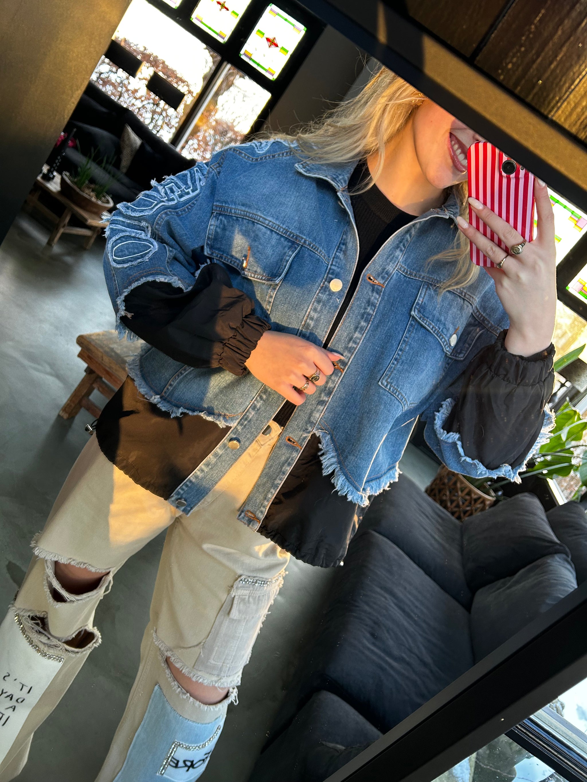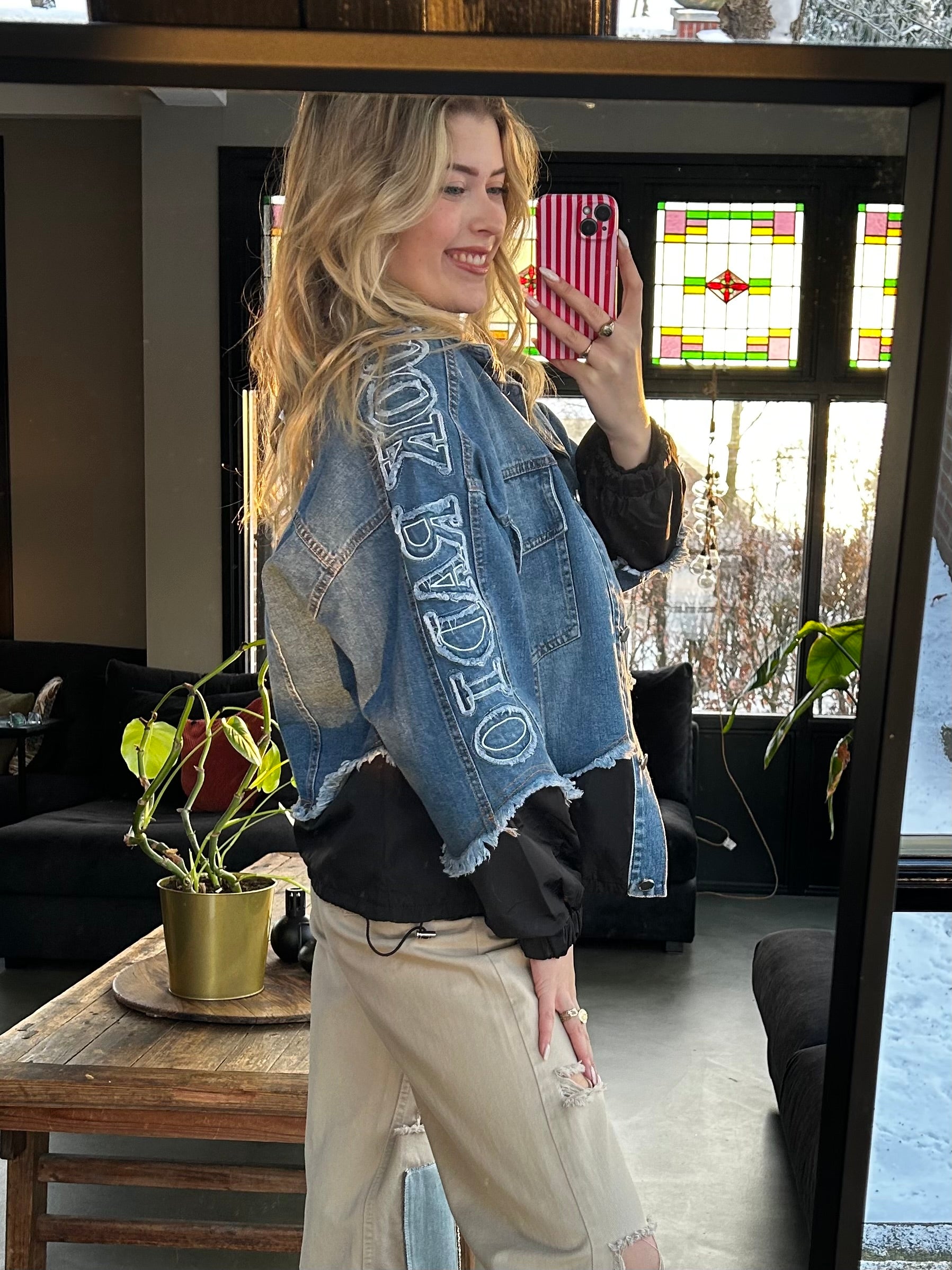 Stoer en uniek. Dit denim jasje combineert klassiek spijker met stoere details in zwart. De onderzijde en mouwen zijn afgewerkt met een licht gewatteerde stof, inclusief een verstelbaar koord aan de onderkant voor een speelse fit. De rafelrand langs de zoom geeft het jasje een edgy touch, terwijl de opvallende tekst op de mouw zorgt voor een echte statement look.
