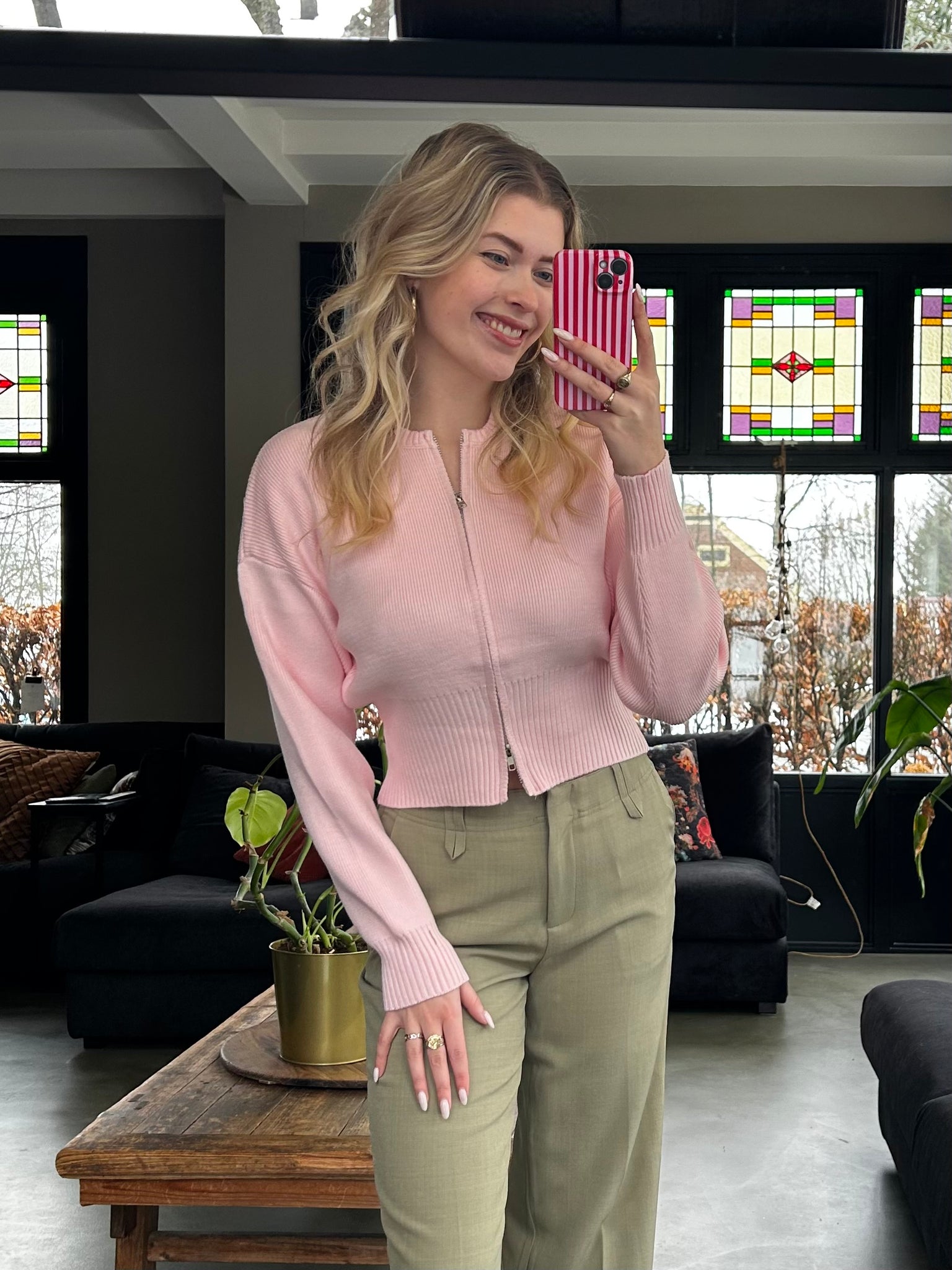 Deze zipper cardigan is een echte eyecatcher voor een jonge, trendy look. De fit en fijne ribstructuur geven het vest een moderne uitstraling, terwijl de rits aan de voorkant zorgt voor een speels en stijlvol detail. De zachte stof draagt comfortabel en sluit mooi aan op het lichaam. Perfect om open of dicht te dragen, kies jouw stijl helemaal zelf door de ritsen aan beide kanten! Wil jij dat het vestje aangesloten zit kies dan een maatje kleiner, wil jij die loose fit effect hebben kies dan een maatje groter.