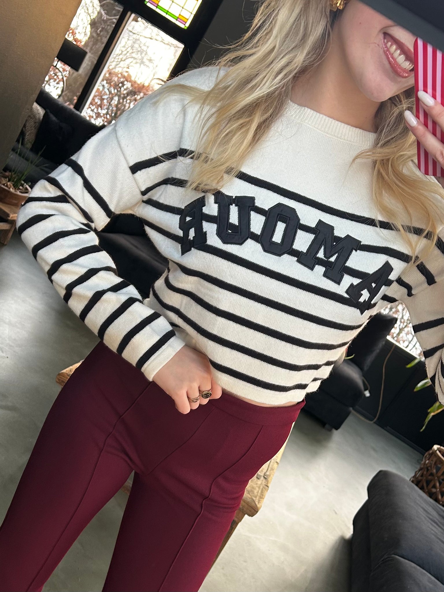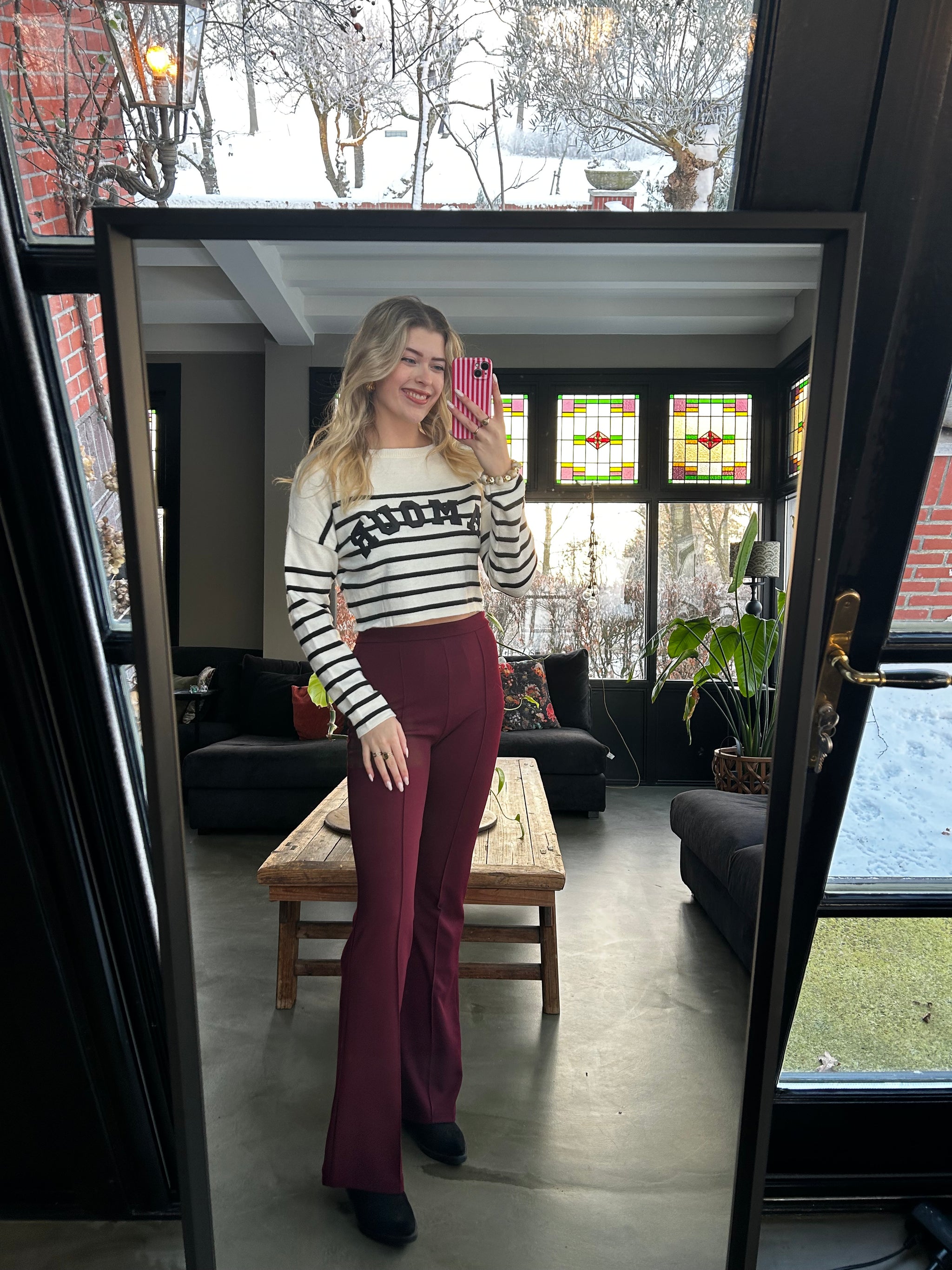 Een speelse sweater met een Franse knipoog. Deze cropped sweater is uitgevoerd in een frisse crème kleur met zwarte strepen en de tekst Amour op de borst. Het korte model geeft een trendy uitstraling. De zachte stof draagt comfortabel en maakt dit item ideaal voor een casual, maar stijlvolle look.