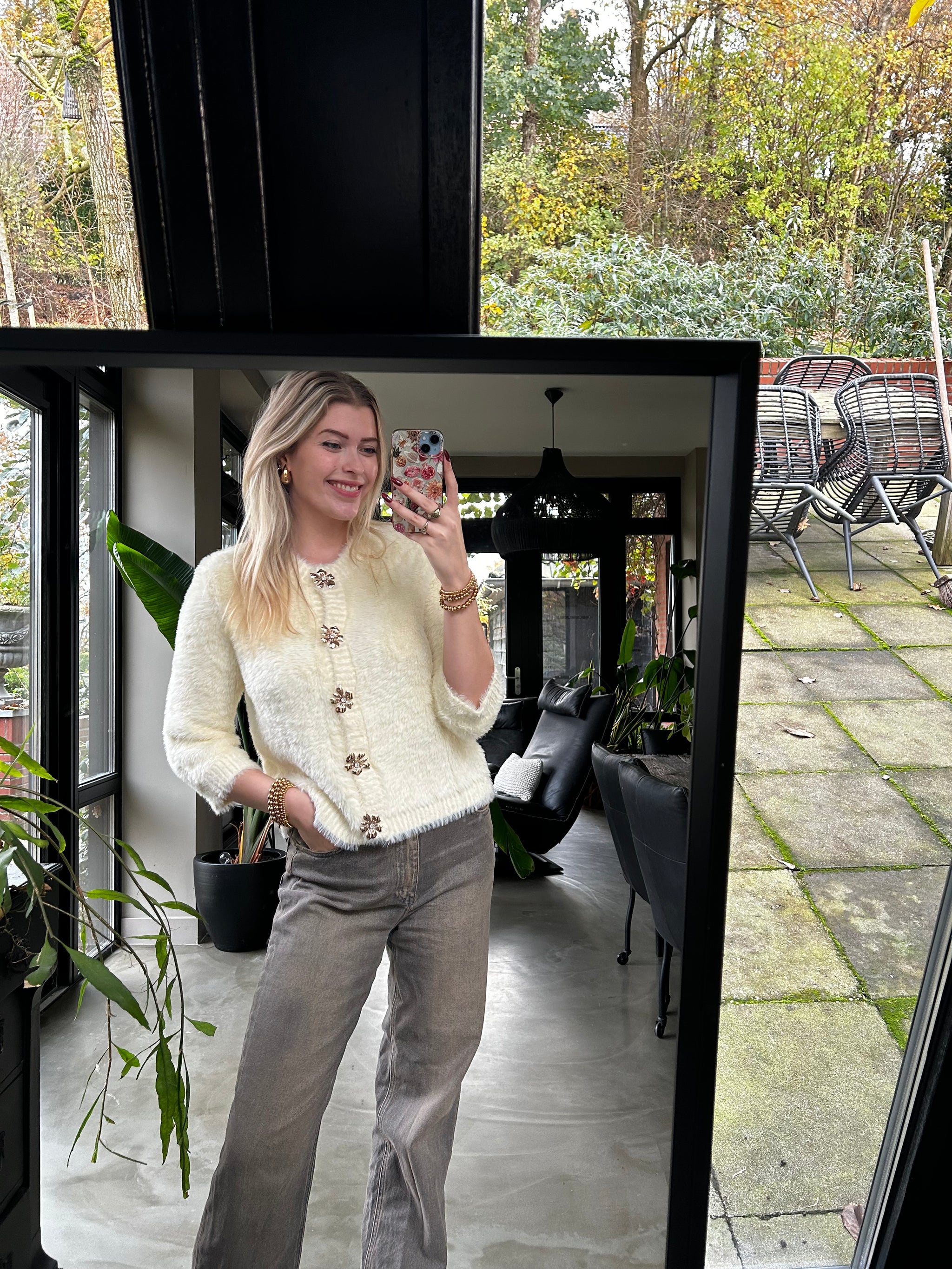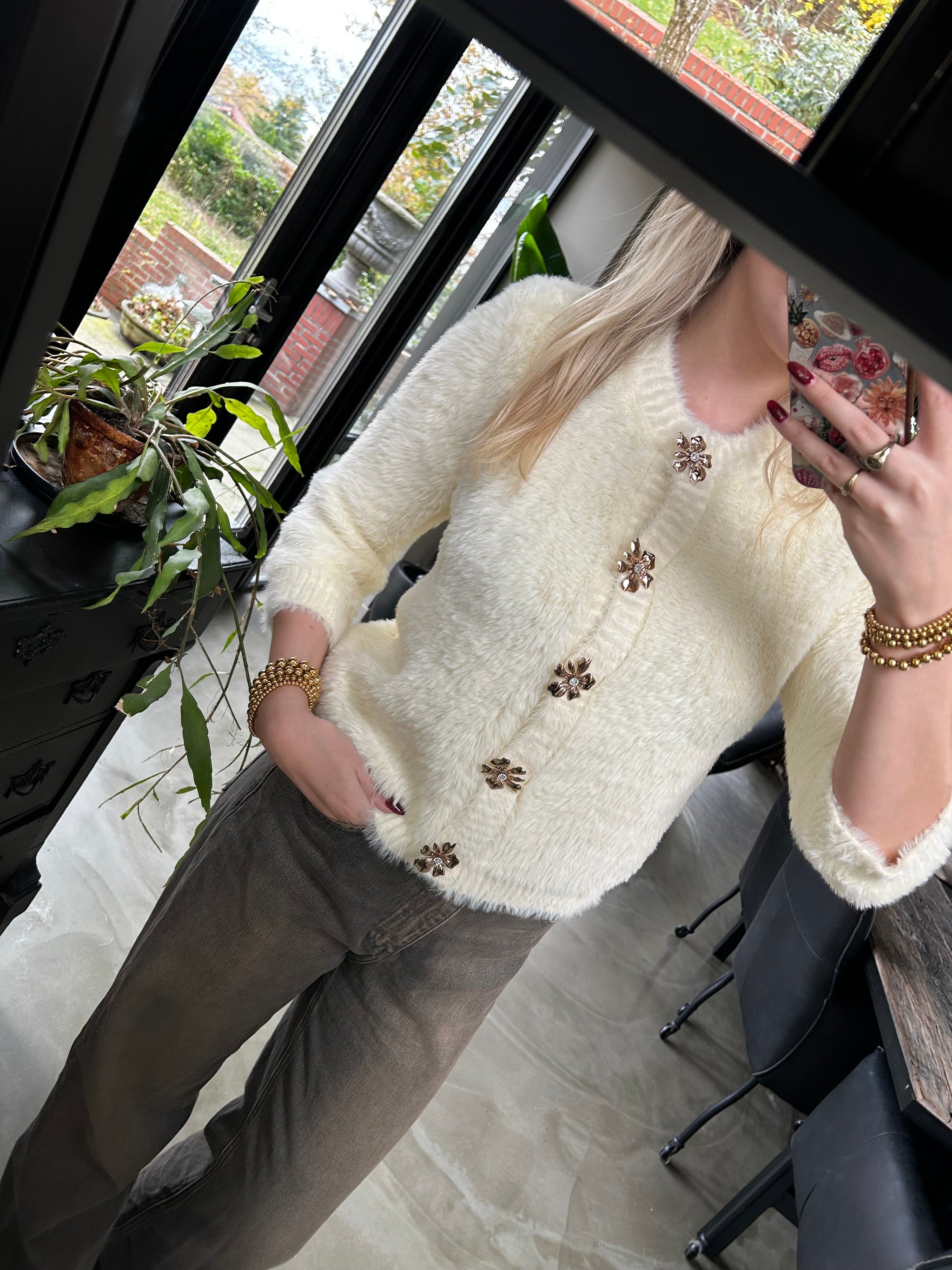 De zachte, fluffy textuur geeft een super luxe uitstraling, terwijl de glinsterende sierdrukknopen het geheel een elegante, almost couture-achtige vibe geven. Perfect om je outfit direct een chique, winterse touch te geven. Heel fijn want deze knopen zijn druk knopen!