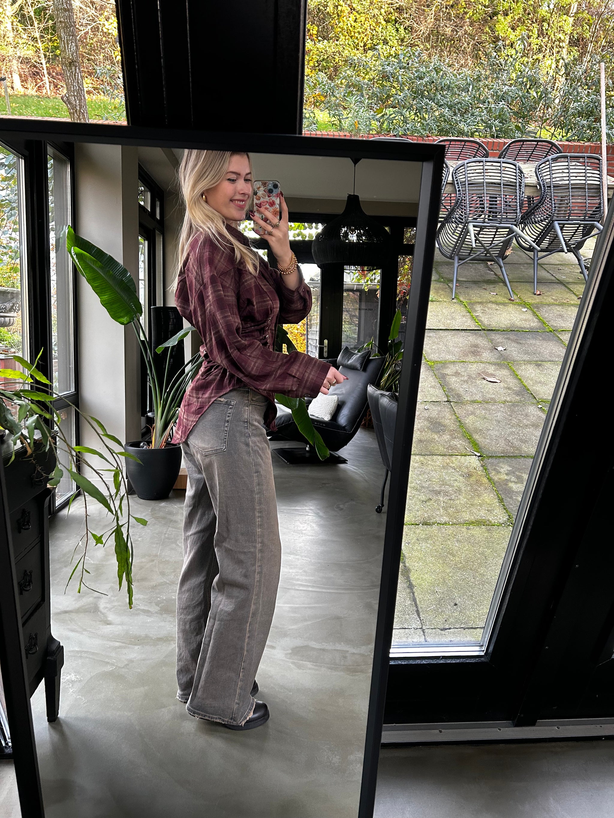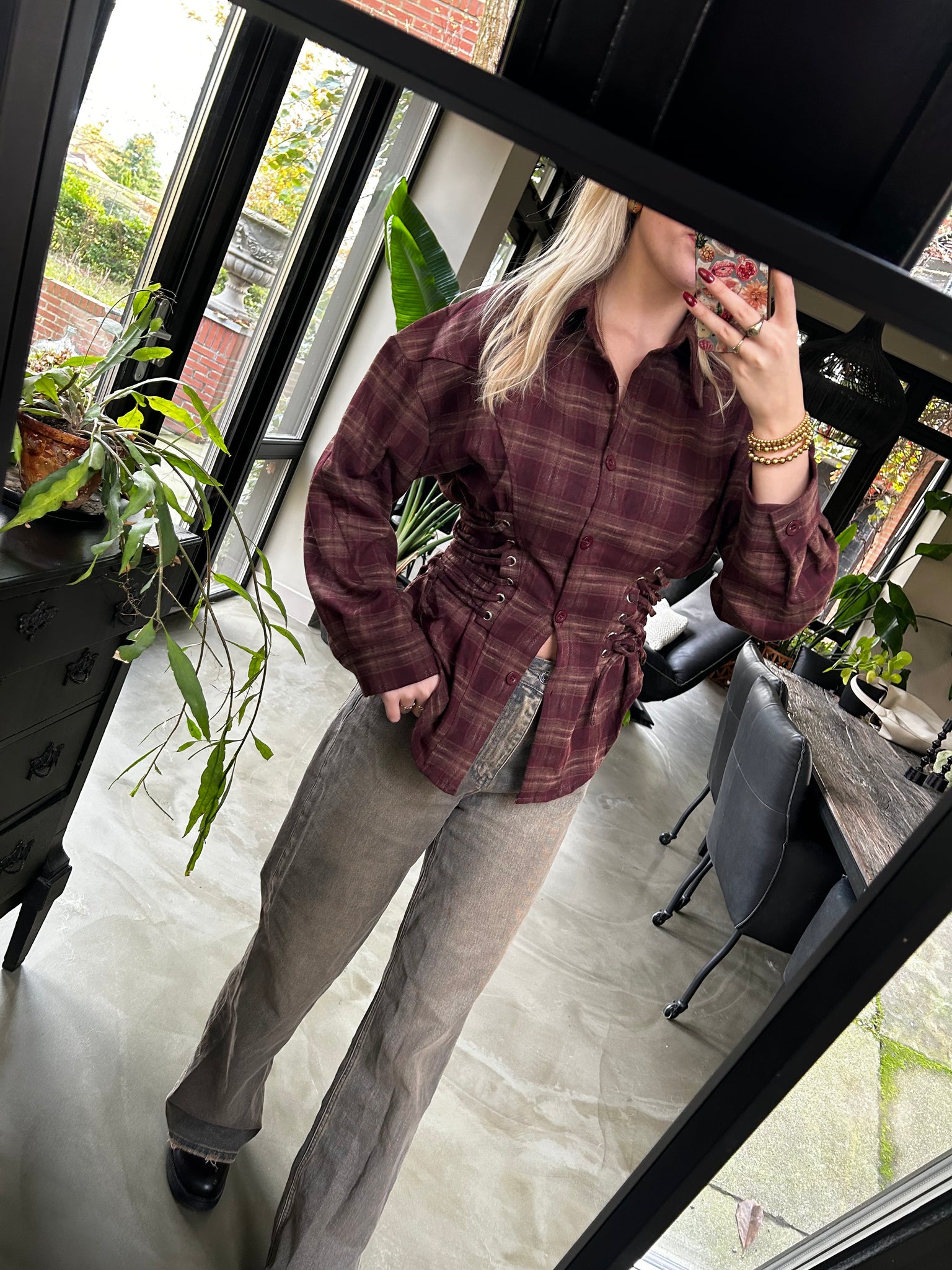 Deze plaid blouse is allesbehalve basic. Het klassieke ruitpatroon krijgt een edgy twist door de opvallende lace-up details aan beide zijkanten. Hierdoor creëert de blouse een mooie, getailleerde vorm die je figuur subtiel accentueert. De warme bordeaux tint maakt ’m perfect voor het najaar en winterse looks.