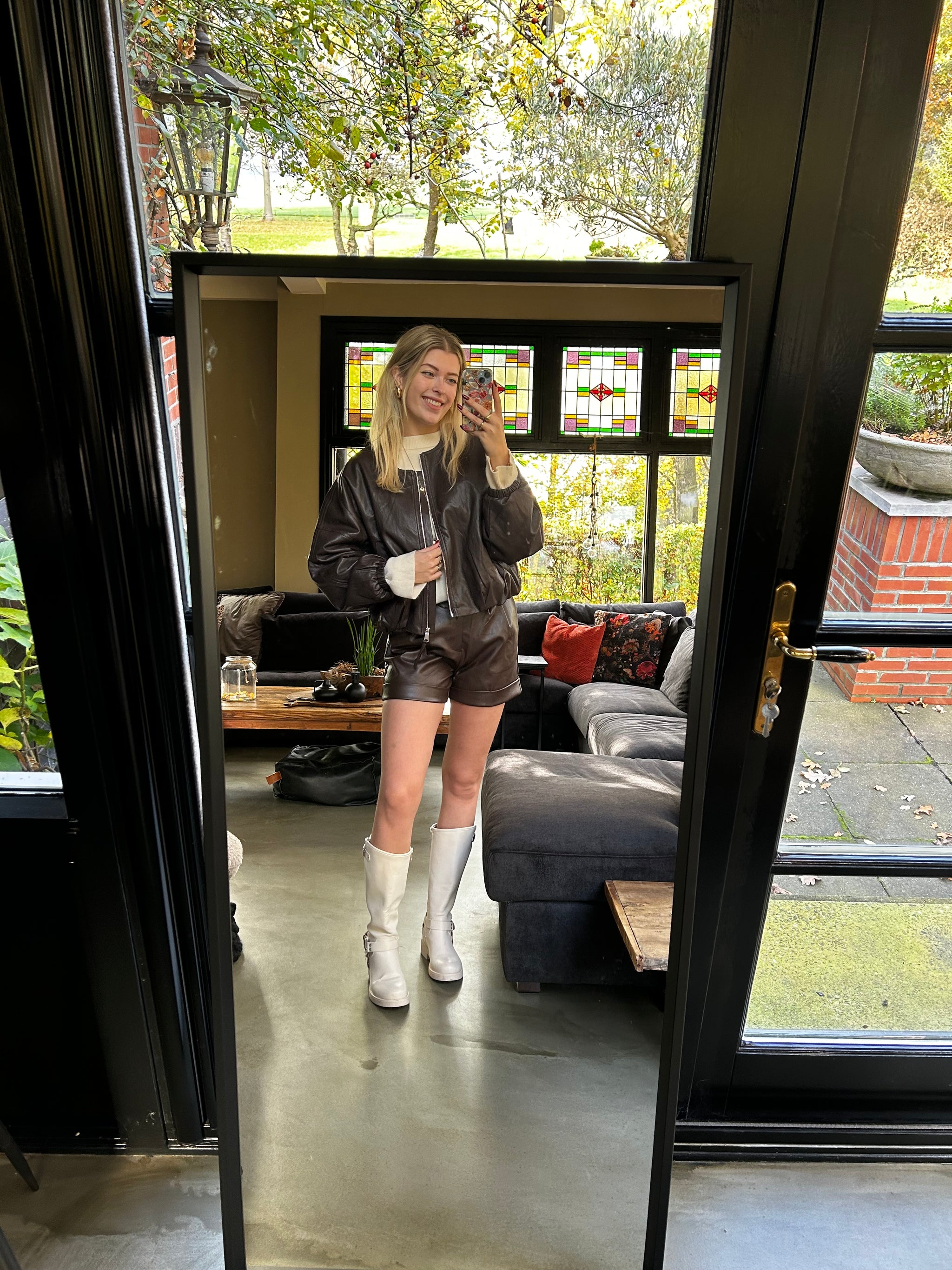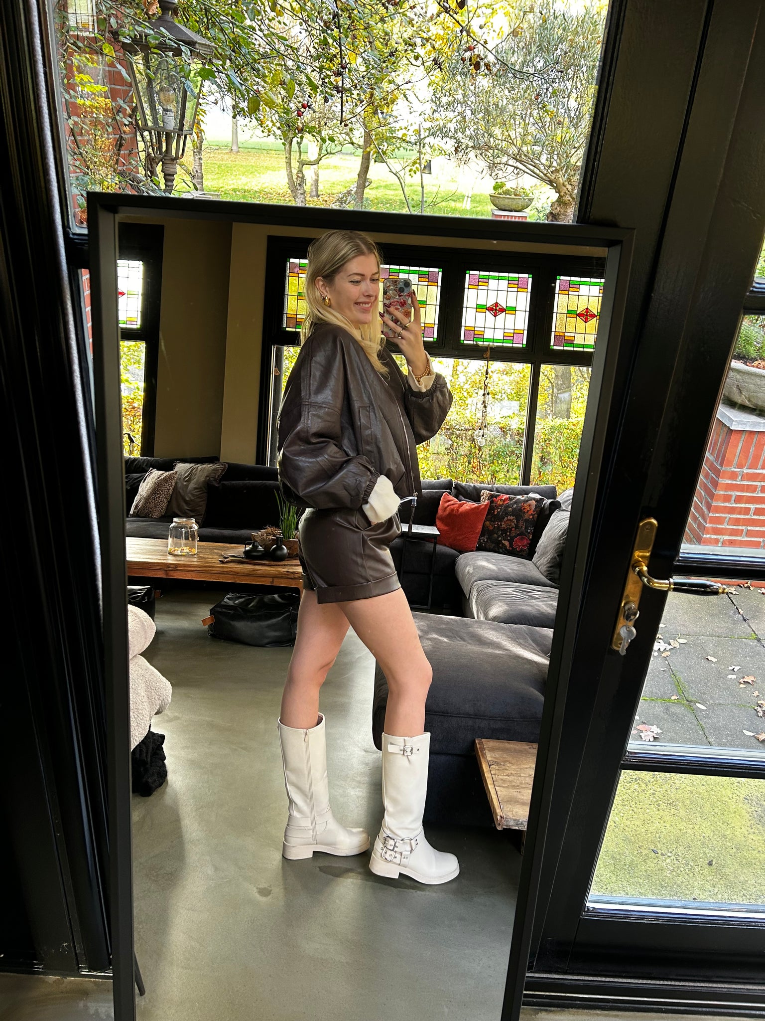 Deze faux-leather short heeft een moderne, stoere uitstraling met een gladde lederlook en een comfortabele, licht hoge taille. De korte pijpjes en subtiele afwerking aan de onderkant geven de broek een luxe, trendy effect. Boven zit een brede band met een knoop aan de linker kant voor net dat beetje extra!